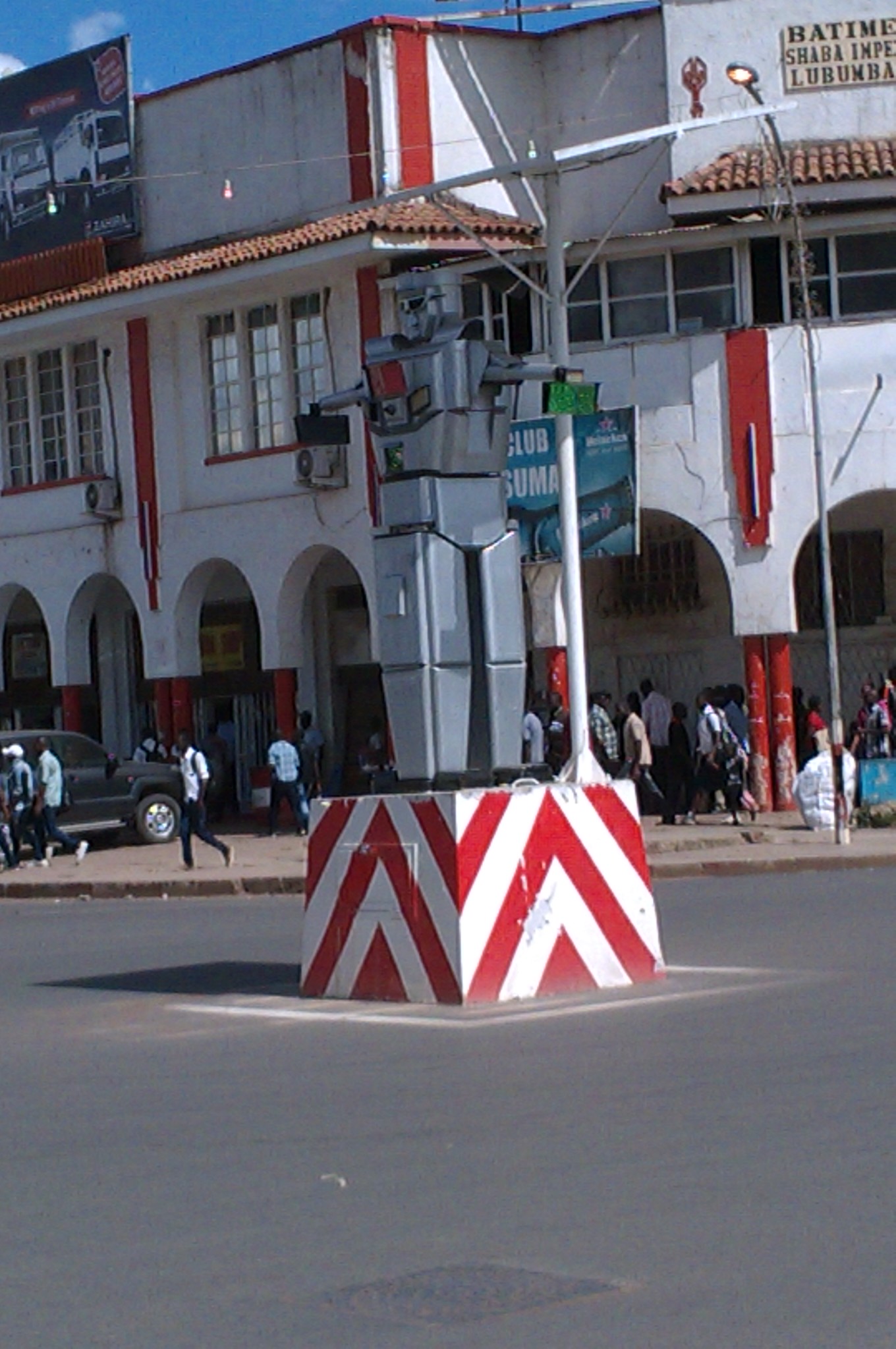 Cette « robot-machine » était déjà en fonction sur certains axes routiers de Kinshasa depuis le début de l’année 2014 avant de faire son apparition dans la capitale cuprifère le 18 mars 2014. Un beau gaillard d’acier mesurant plus ou moins 2 m de hauteur, monté sur une estrade métallique peint aux couleurs rouge et blanc, fonctionnant à l’aide des accumulateurs qui puissent leur énergie des plaques solaires.